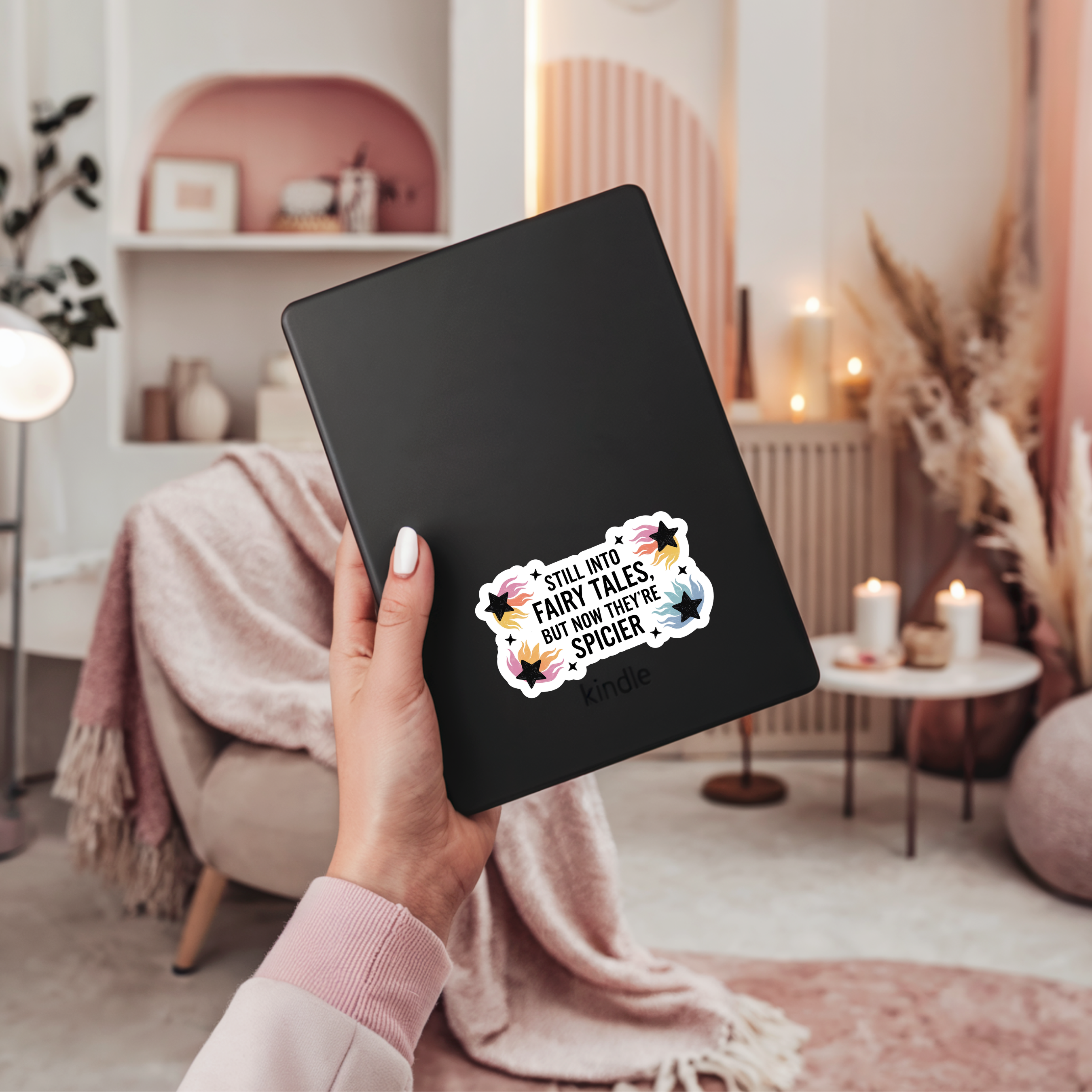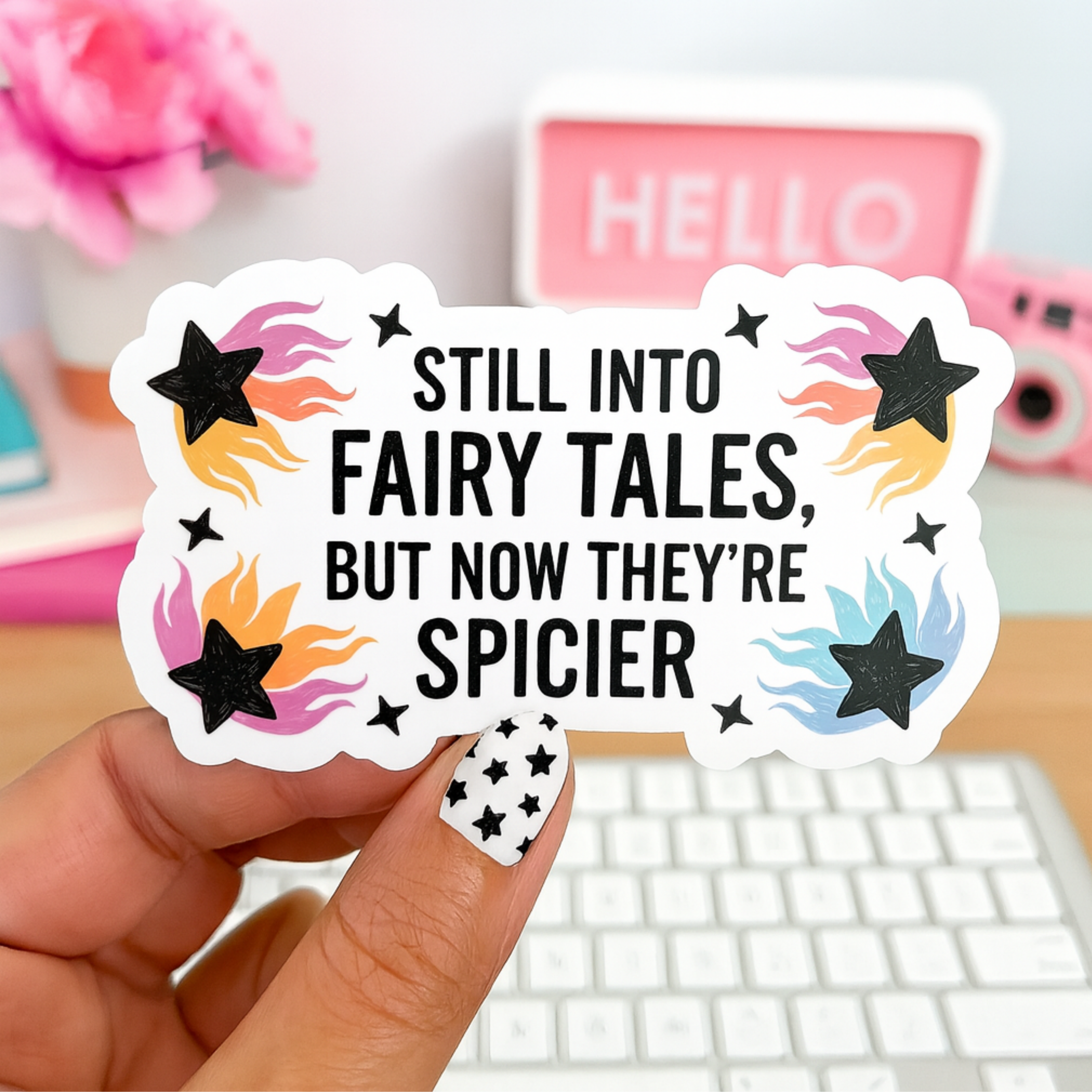 Still Into Fairy Tales, But Now They’re Spicier — if that sounds like your bookshelf, this sticker was made for you! This 3” die cut vinyl sticker is perfect for book lovers who’ve graduated from childhood classics to a little more steam in their stories.